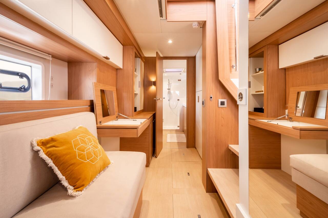 Flexible Layout Options: Available in a three-cabin owner’s version, the Bali 4.4 offers luxurious privacy with the entire port side dedicated to the owner, featuring a large en-suite bathroom with double washbasins and a spacious shower. The four-cabin version accommodates up to eight guests, with each cabin having its own private bathroom. Additionally, optional skipper cabins in the bow and a lowerable table in the saloon add flexibility for charter or personal use.