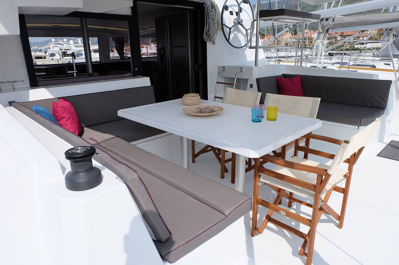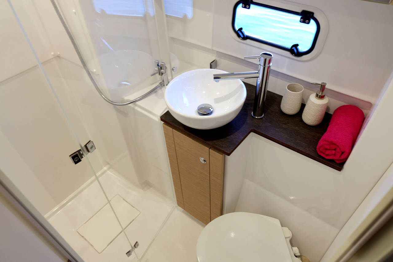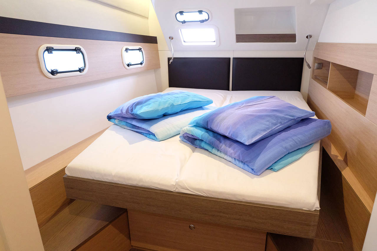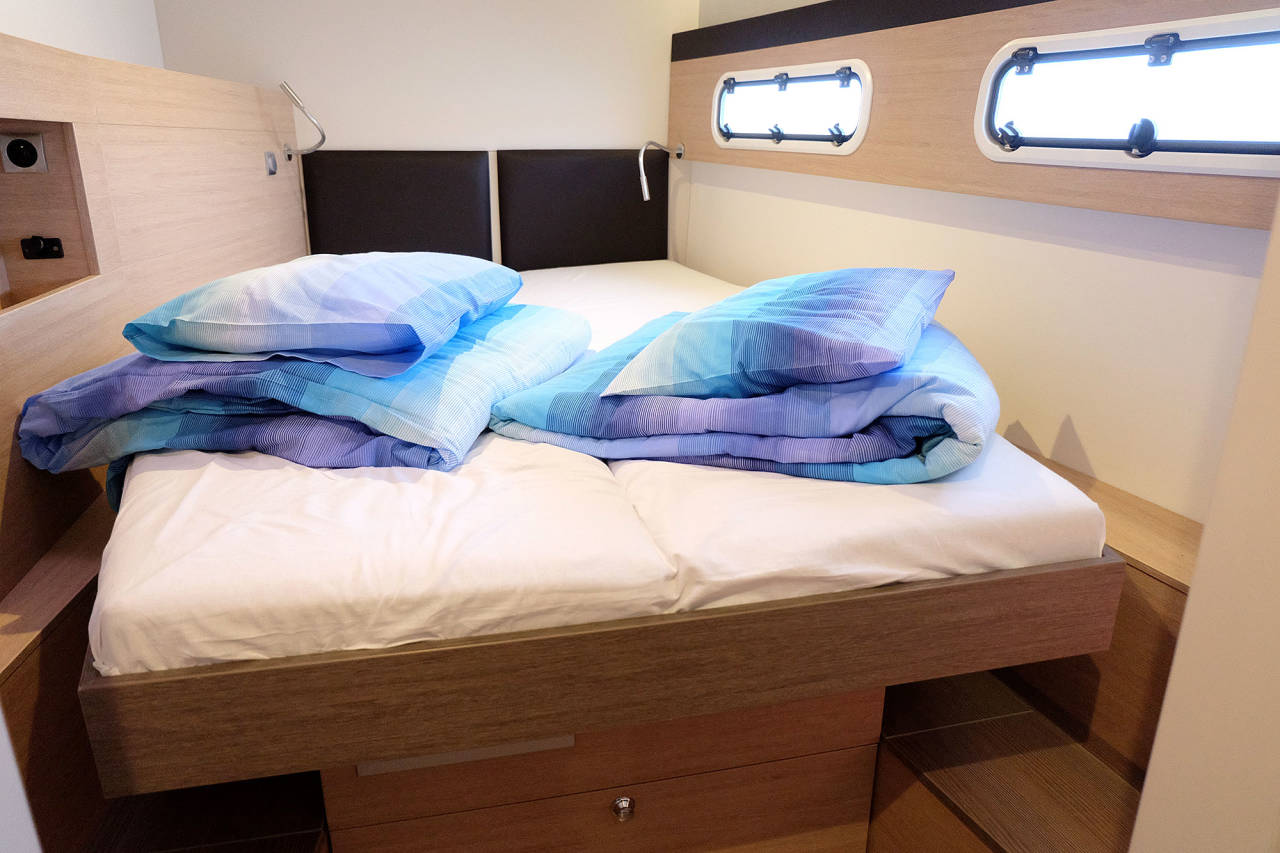 4 cabin – 4 heads, Pack Excellence, Premium pack, Engine upgrade 2 X Volvo engines 55 HP, Generator, Air conditioning for 4 cabins and saloon, Windlass remote at helmsman position, Raymarine electronic pack, VHF Cobra MR F5525 kg anchor with 80 m chain, Electric toilette pumps, Helmsman bimini top with stainless steel frame, Enclosure for bimini, Sunbathing cussions foredeck, Sunbathig cussions for coachroof, Bearths in forepeaks, Forward cockpit removable tables, Blackout curtains, Convertible saloon table to double berth, Convertible aft cockpit table for double berth, Coffee machine, Radio CD(MP3/USB) player with saloon and cockpit speakers, LCD TV 32'' in saloon + Glomex antenna, …