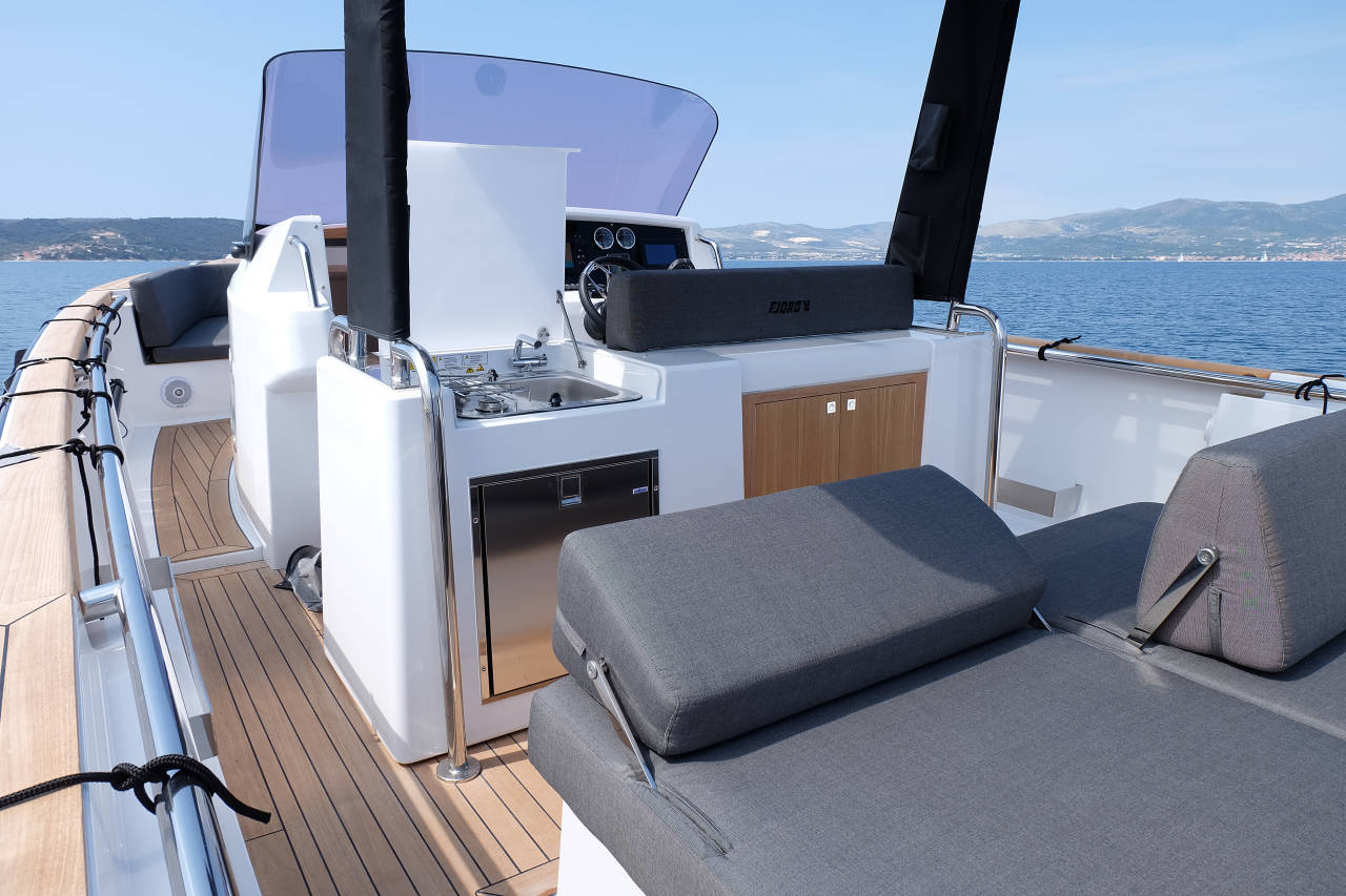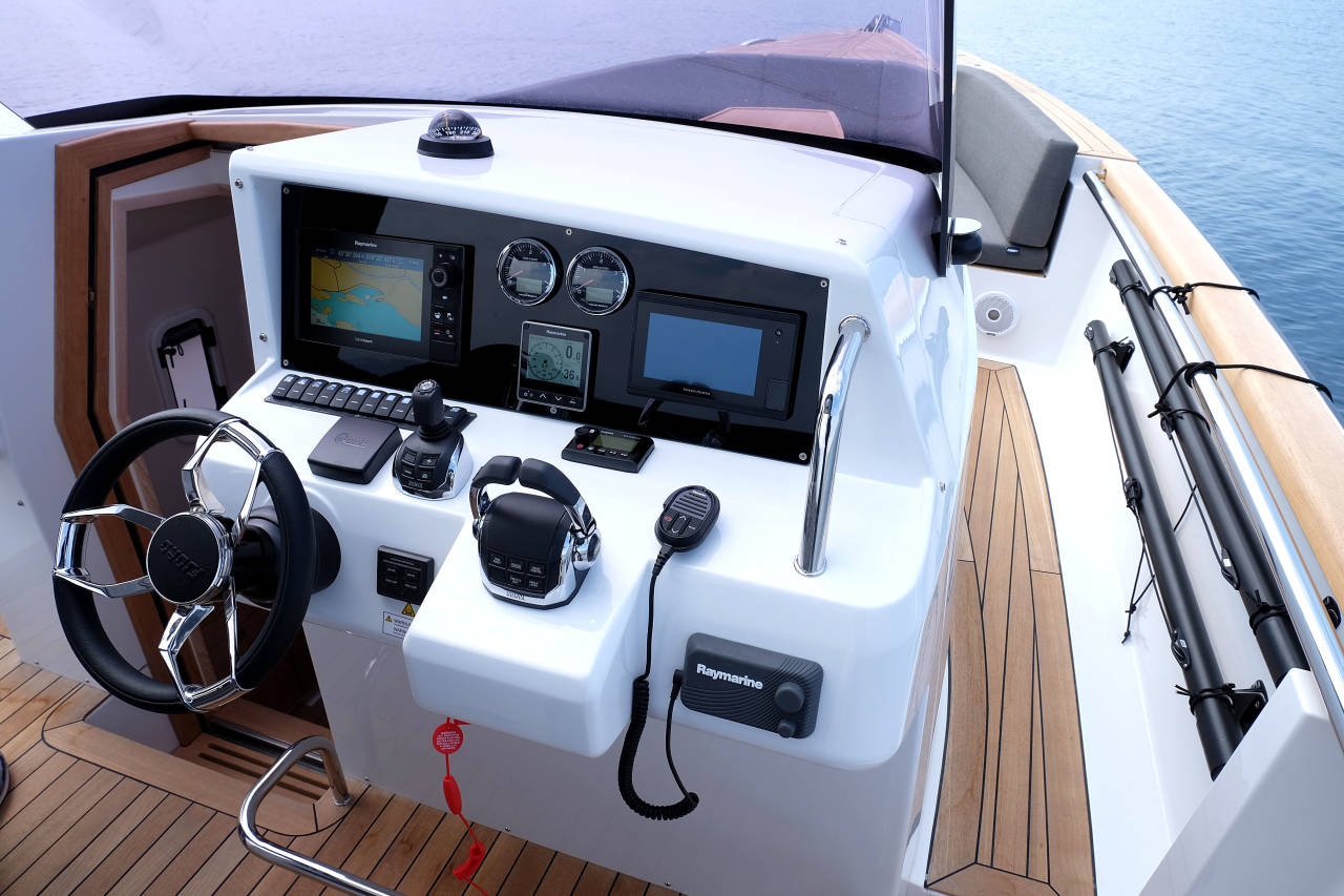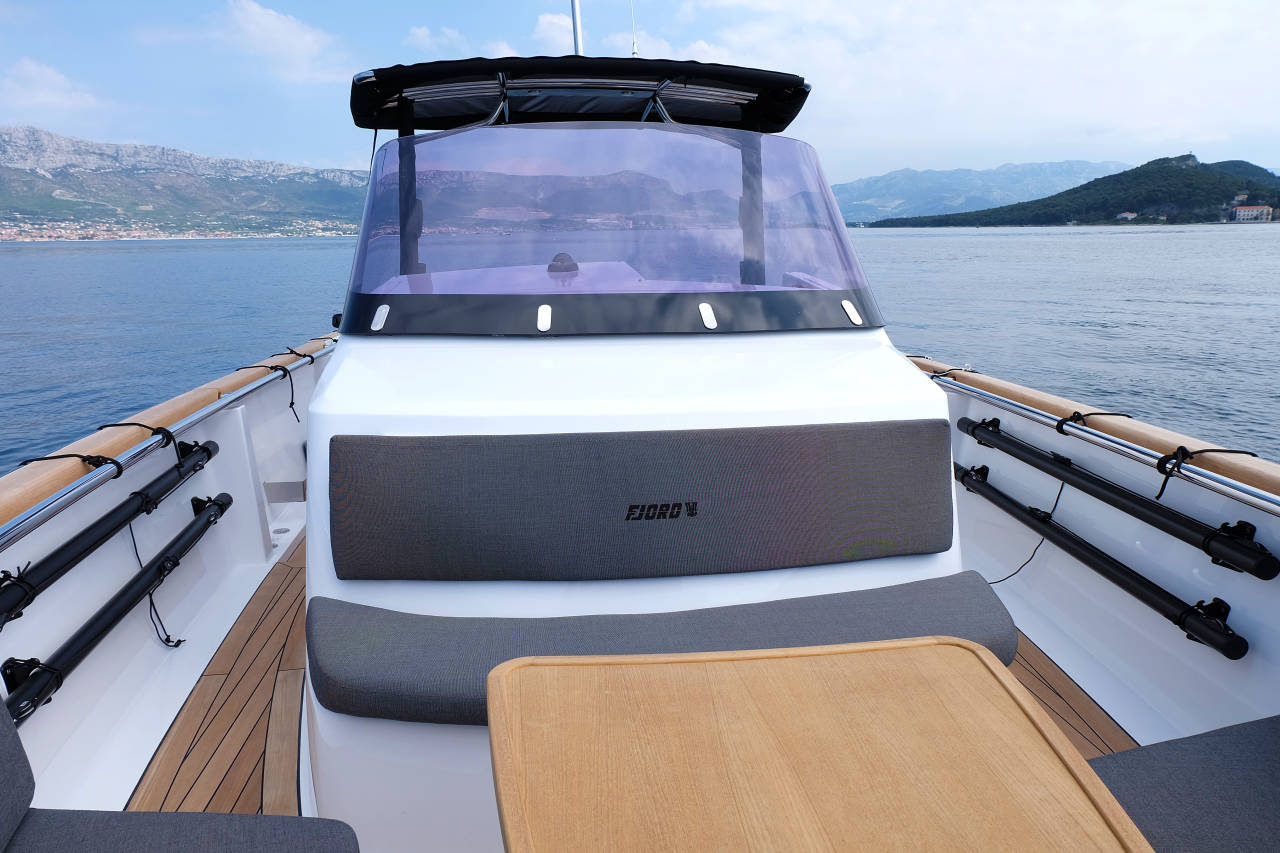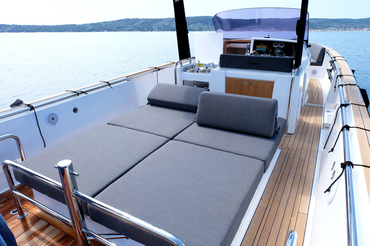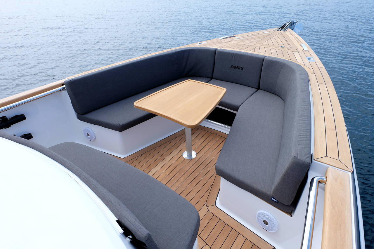 Created with the trademark FJORD aesthetics in mind by Patrick Banfield, the minimal design sets a clear mark for all eyes to be awed by. An artfully integrated combination of a performing hull and elegancy reveals a fast and safe powerboat packing the looks, as well as power. Overlooking the spacious deck is a frame-less windshield, offering unlimited panorama as well as maximum visibility. Just choose a destination and ride out to it, enjoying a comfortable cruise at an impressive speed of 40 knots. Stride along the waves or take them head on; the vertical bow design towers over the seas as it looks up to the sun.