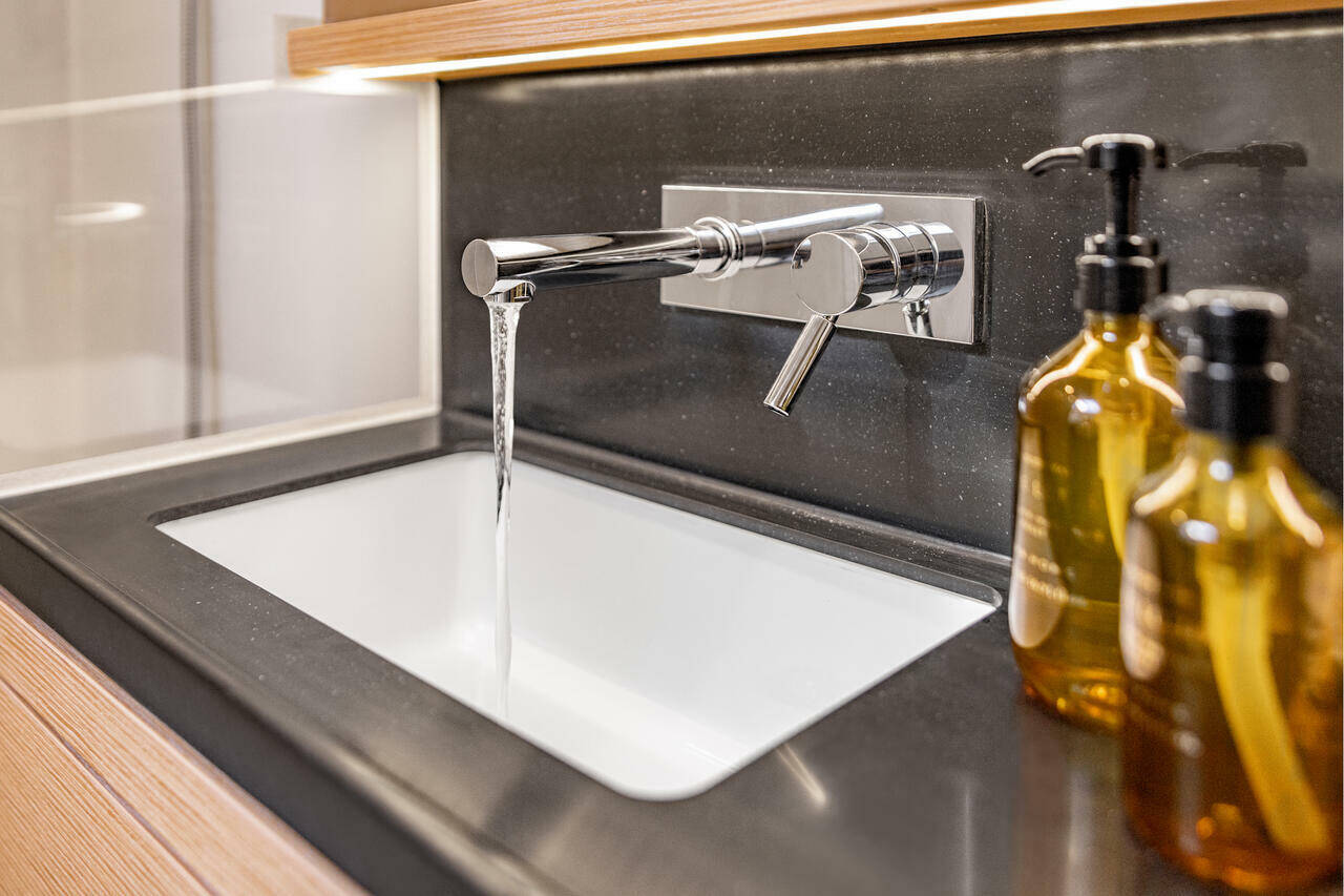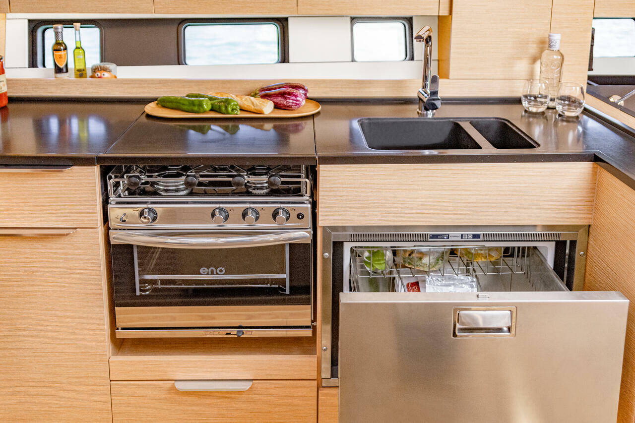 Worktop and sink of the galley in Marine Mineral Stone (colour selection)