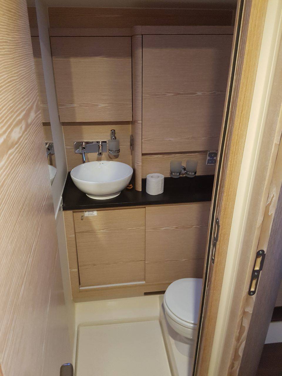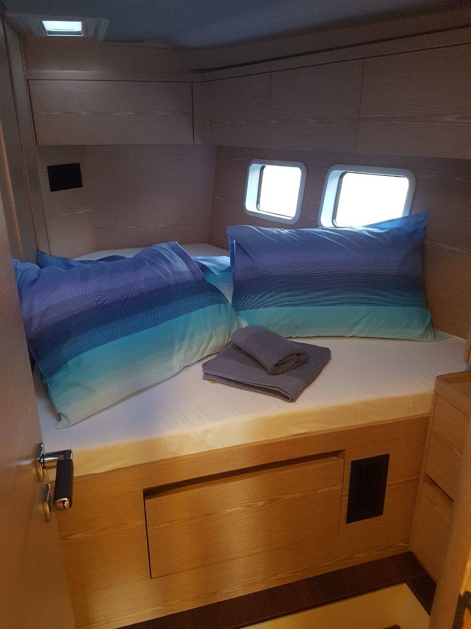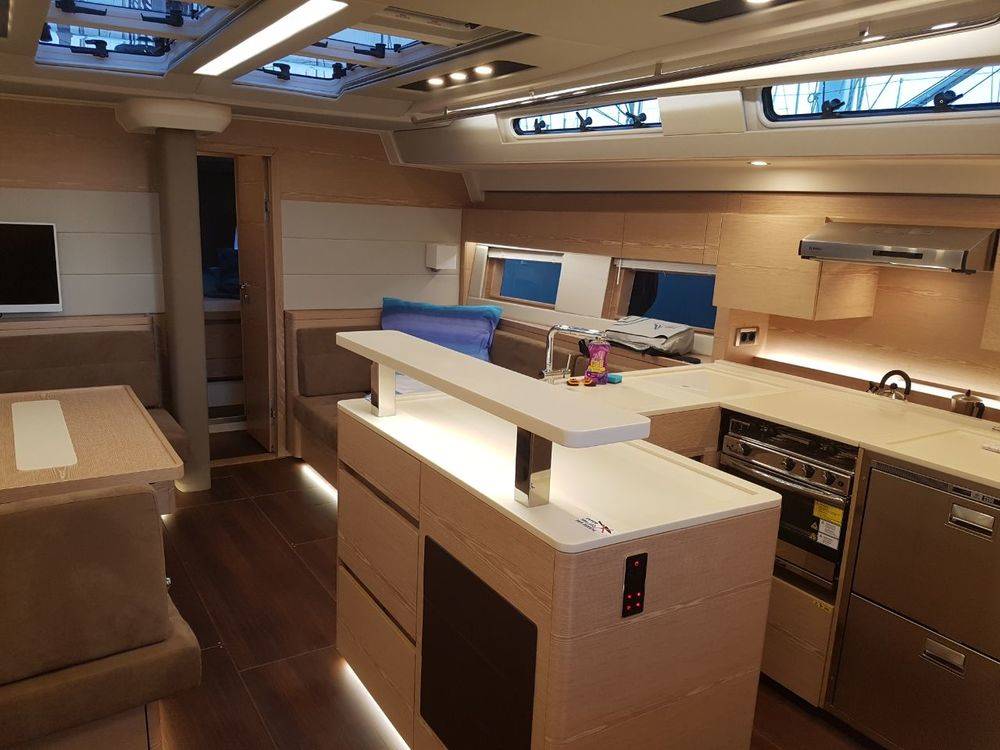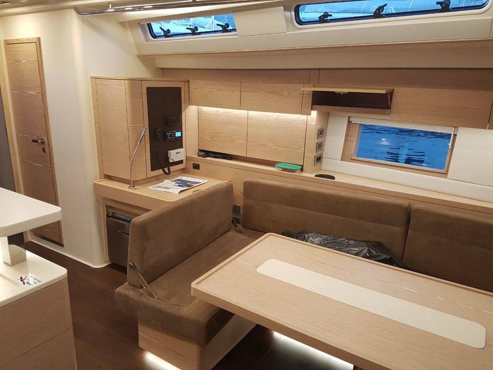 A2, B2, C2, D1, E1 layout option, Italian Oak furniture, Noce Nero floorboardsMonte Carlo upholstery, Worktop in galley-Corian Vanilla, Salon table convertible to double berth, Coffee machine, 2 x LEWMAR 65 EST electrical halyard winches, Hydraulic bathing platform incl. remote control, Teak deck, 2 helmsman seats covered with teak, Inmast Furling system, Bimini top, Sprayhood, Generator, Air Condition, Electrical toilette pumps, Additional freezer-front opening, Radio CD/USB player with salon and cockpit speakers, LED TV 32’’ with Glomex antenne, Anchor chain counter and remote control in cockpit, Sunbed cushions on coachroof