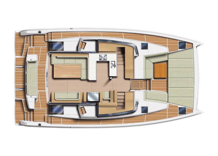 U srcu jahte, salon impresionira svojim prostranim XXL stolom za ručavanje za do 12 gostiju, udobnom klupom u obliku slova L i posebnim prostorom za opuštanje, savršenim za druženje i opuštanje u apsolutnom komforu.