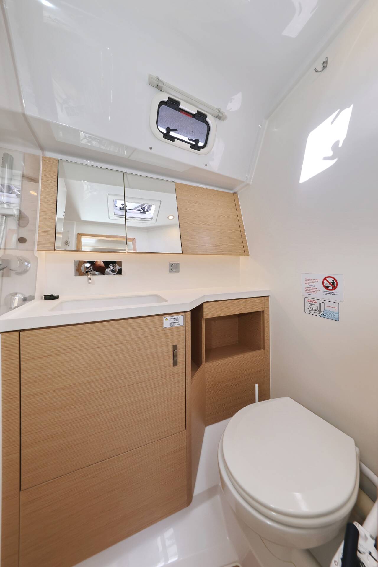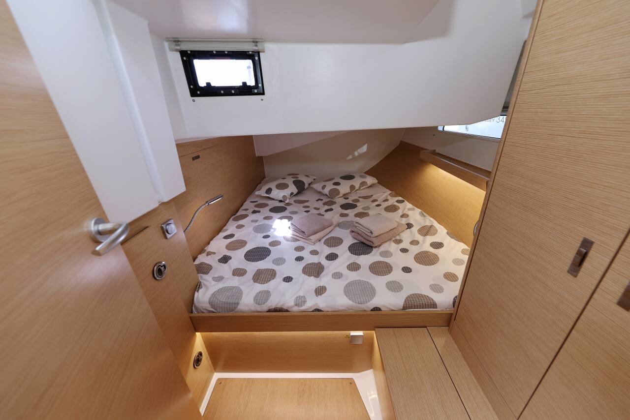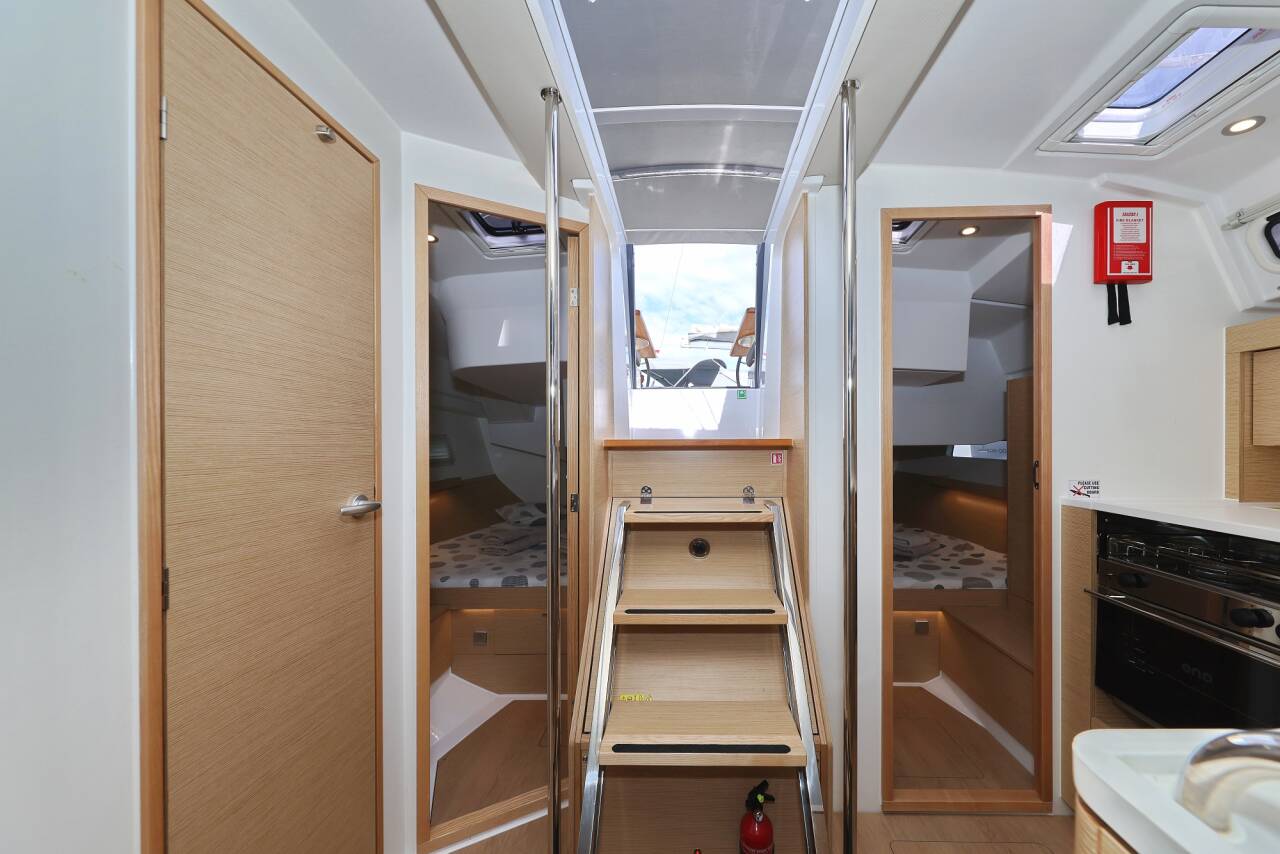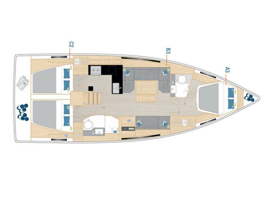 C2: L-galley on port and head with separate shower stall on stb. 2 aft cabins with double berth, locker and storage.