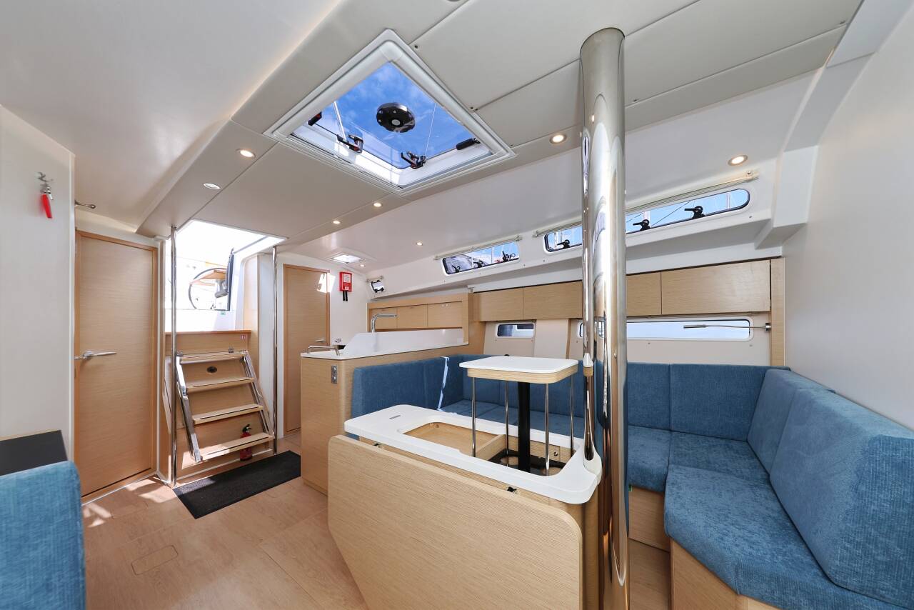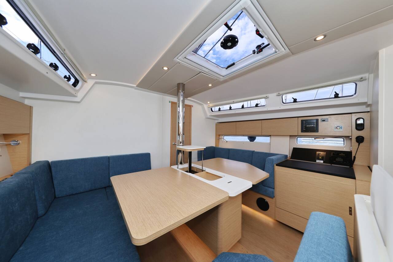 B3: Saloon with large dining area on port and sofa with multi function unit, navigation console and storage on stb