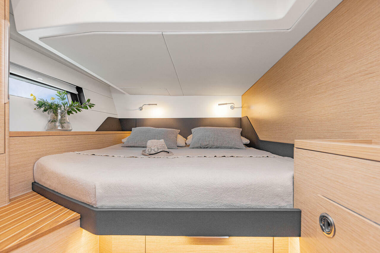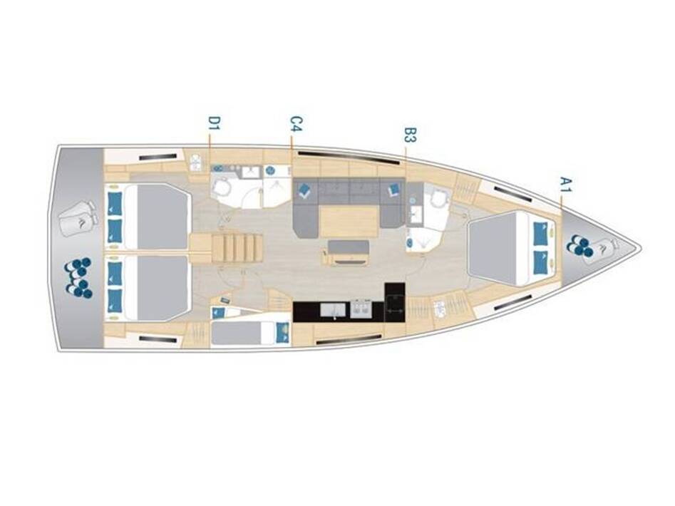Ovaj model dolazi sa rasporedom sa 4 kabine i 2 toaleta, a nudi prostranu vlasničku kabinu sa centralno postavljenim bračnim ležajem i privatnim toaletom, uz tri udobne gostinske kabine i drugi toalet. Svetla, produžena galija i salon otvorenog koncepta stvaraju prijatnu, prozračnu atmosferu koja je idealna za porodična krstarenja ili duge plovidbe.