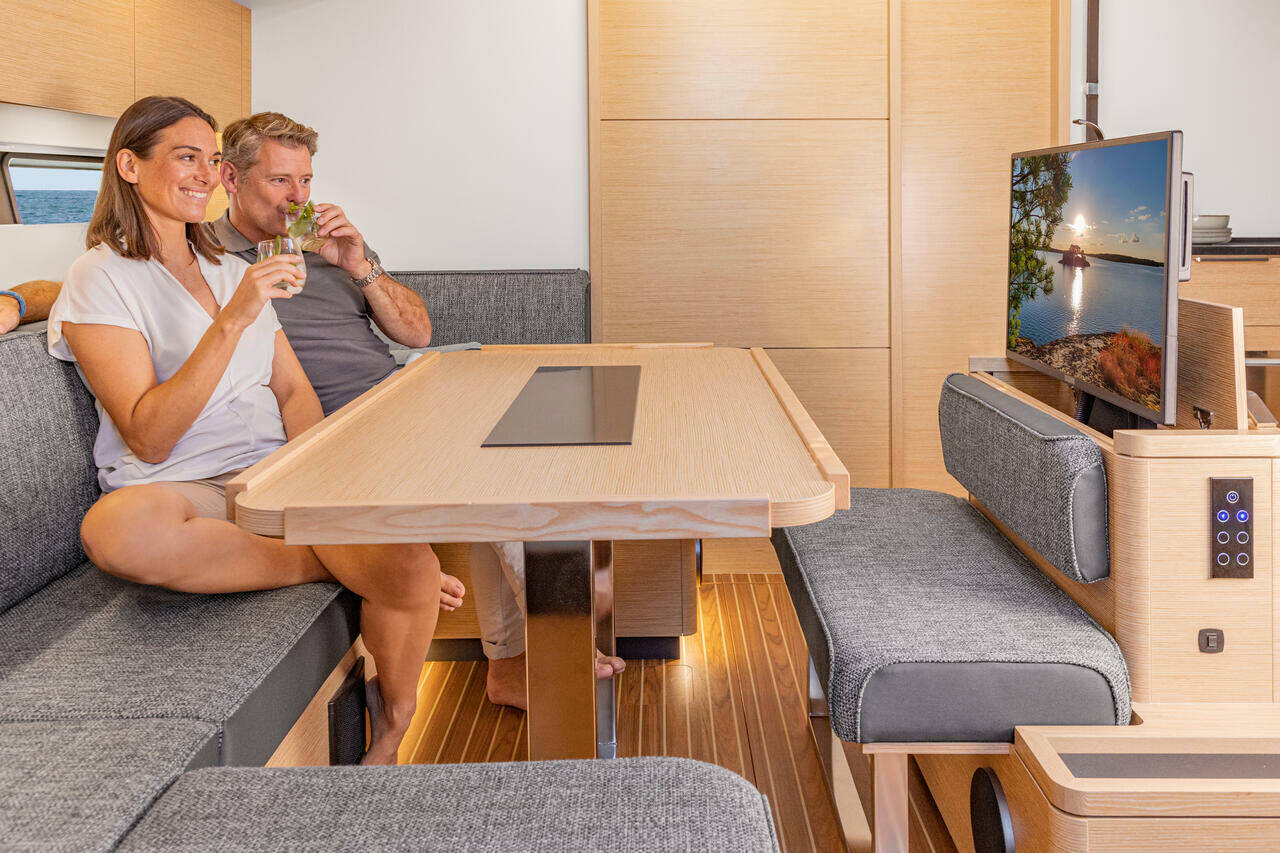 Saloon table electrically lowerable with cushions, convertible into double berth