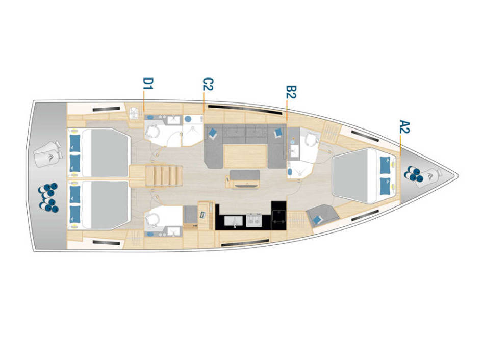 Potpuno opremljena i spremna za čarter. Navedena cena važi ako jahta ostane u našem programu upravljanja čarterom Hanse Yachting World, u suprotnom se primenjuje dodatak od 6%.