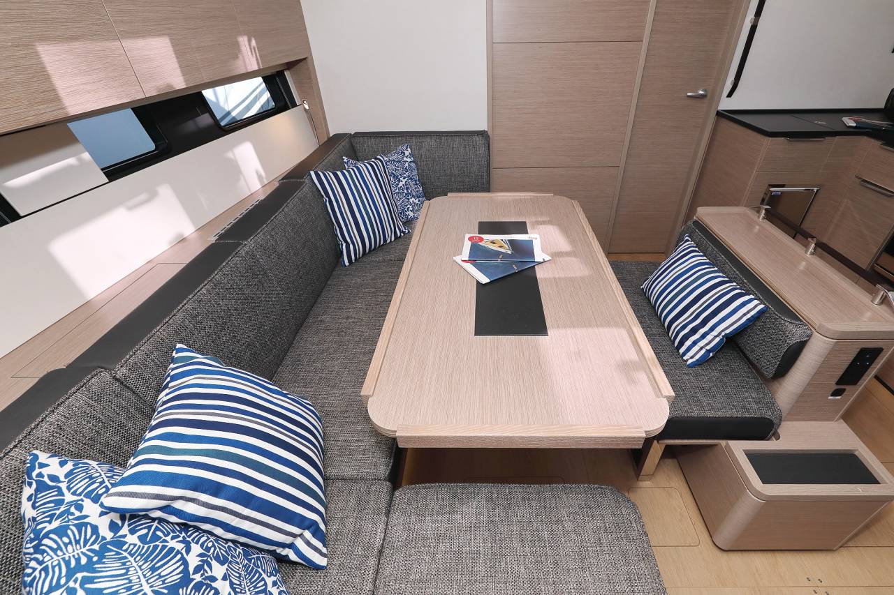Saloon table electrically lowerable with cushions, convertible into double berth