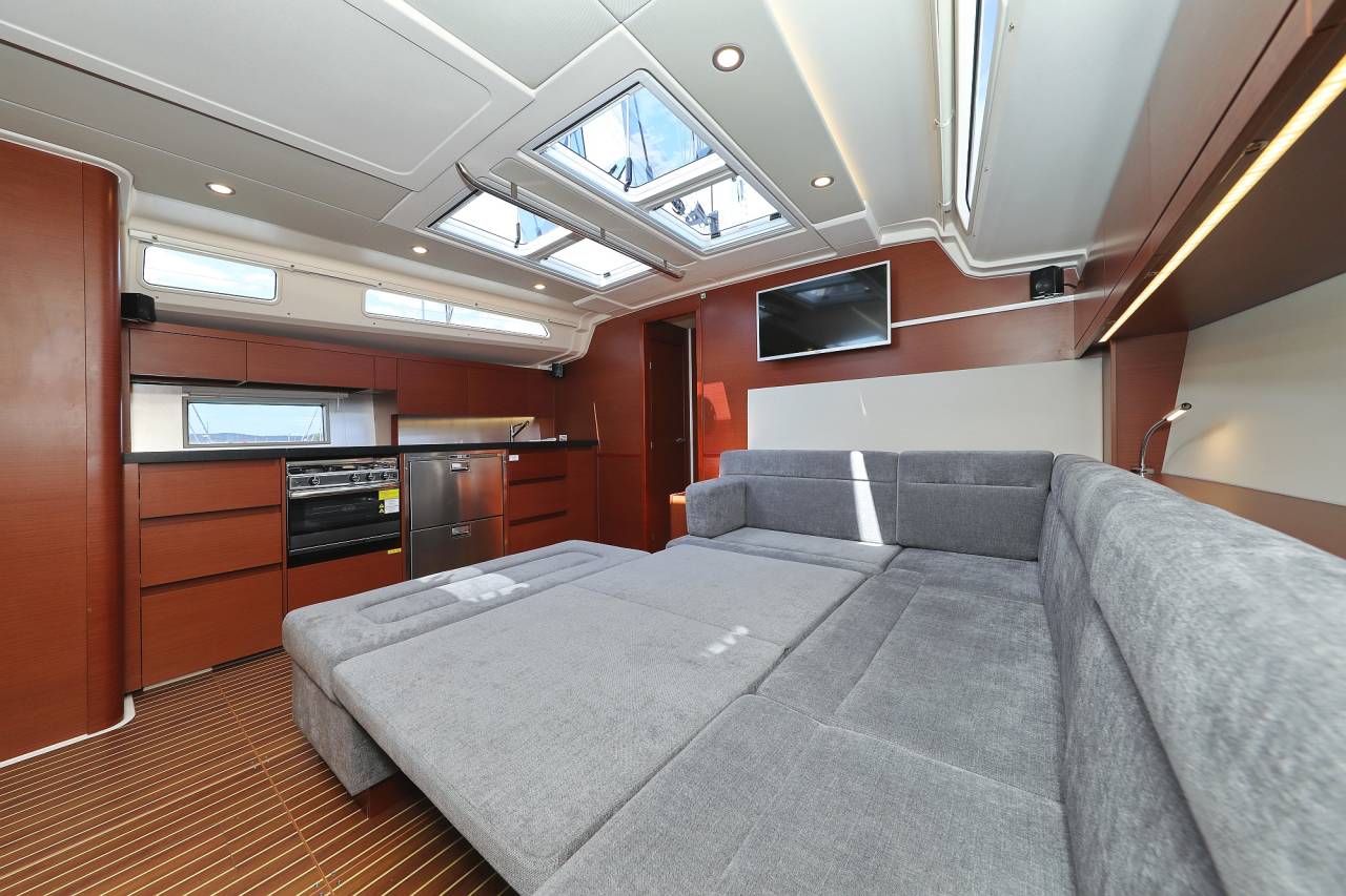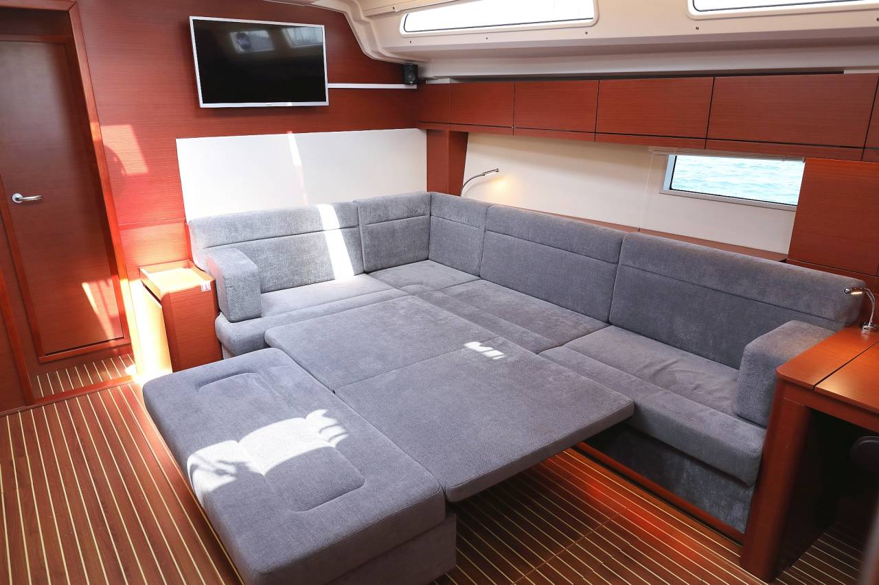 - Saloon table electrically lowerable with cushions, convertible into double berth