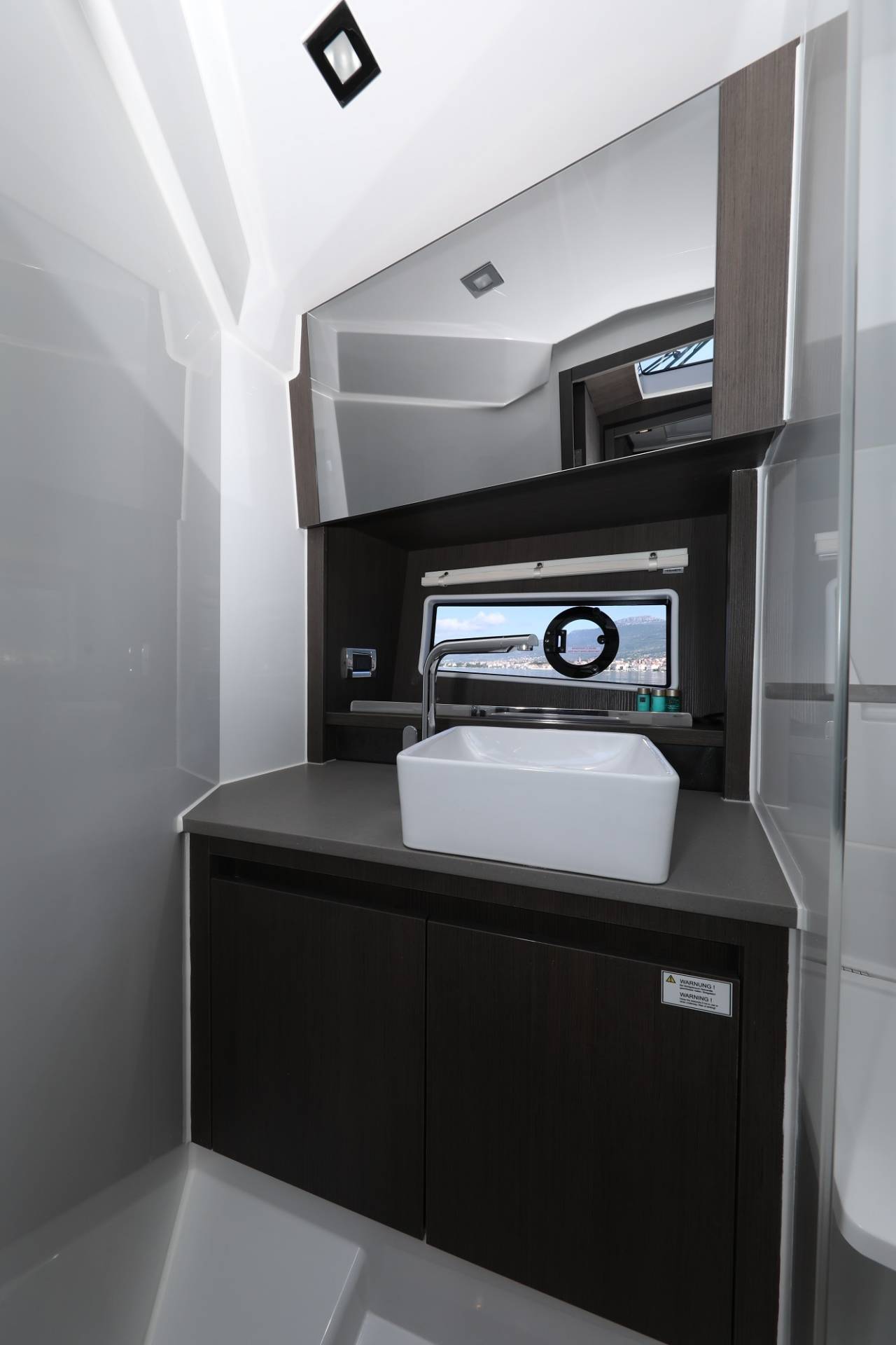 Sealine C335v ima savremen i prostran enterijer. Veliki prozori omogućavaju obilje prirodne svetlosti i zadivljujuće poglede na okolinu. Salon je udoban i privlačan, sa U-oblikovanim kaučem i trpezarijskim stolom za do šest osoba. Kuhinja je potpuno opremljena svim potrebnim aparatima. Brod takođe ima dve kabine sa bračnim ležajevima i odvojenim toaletnim prostorom sa tušem.