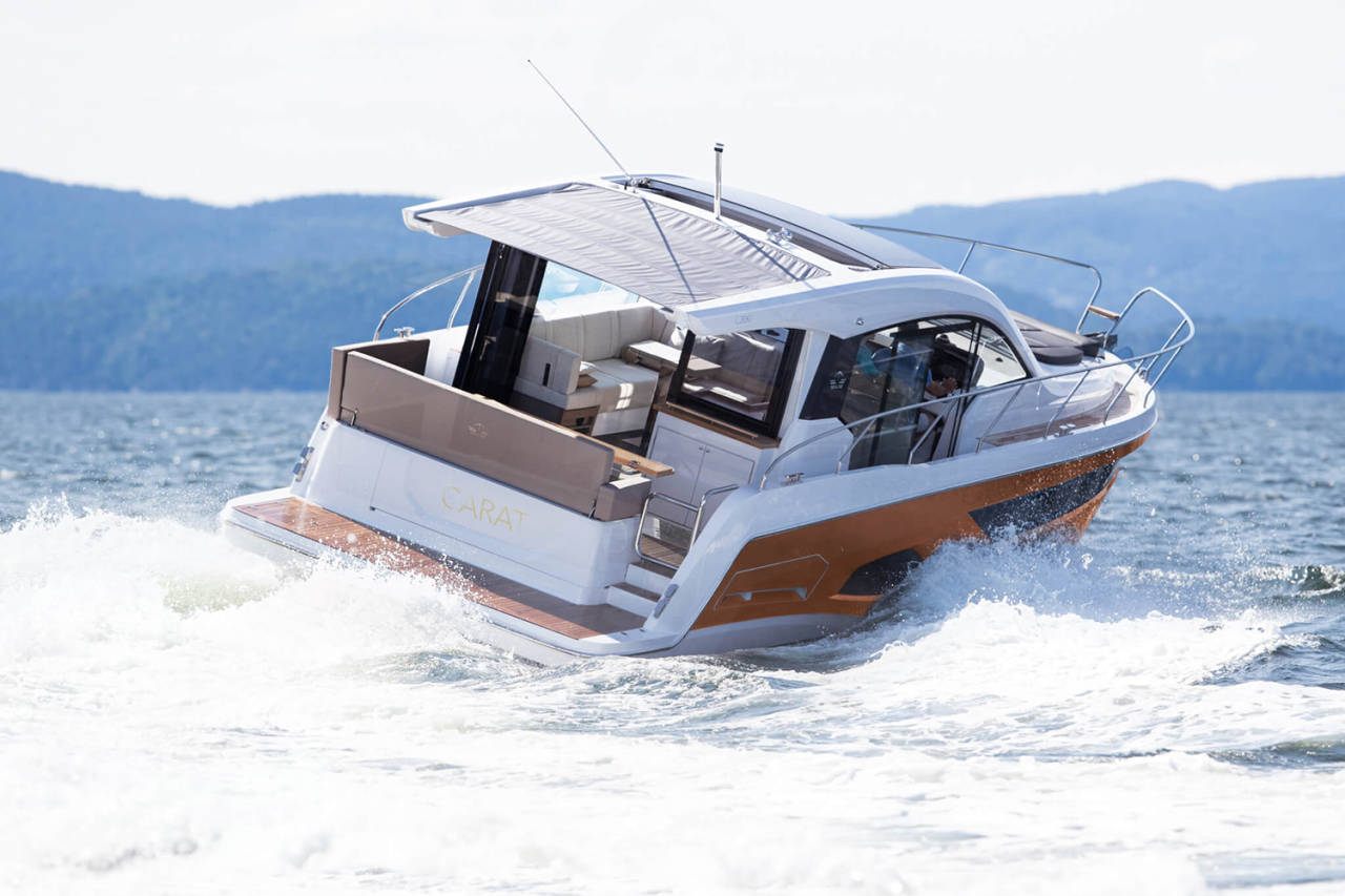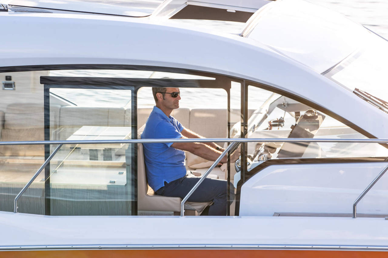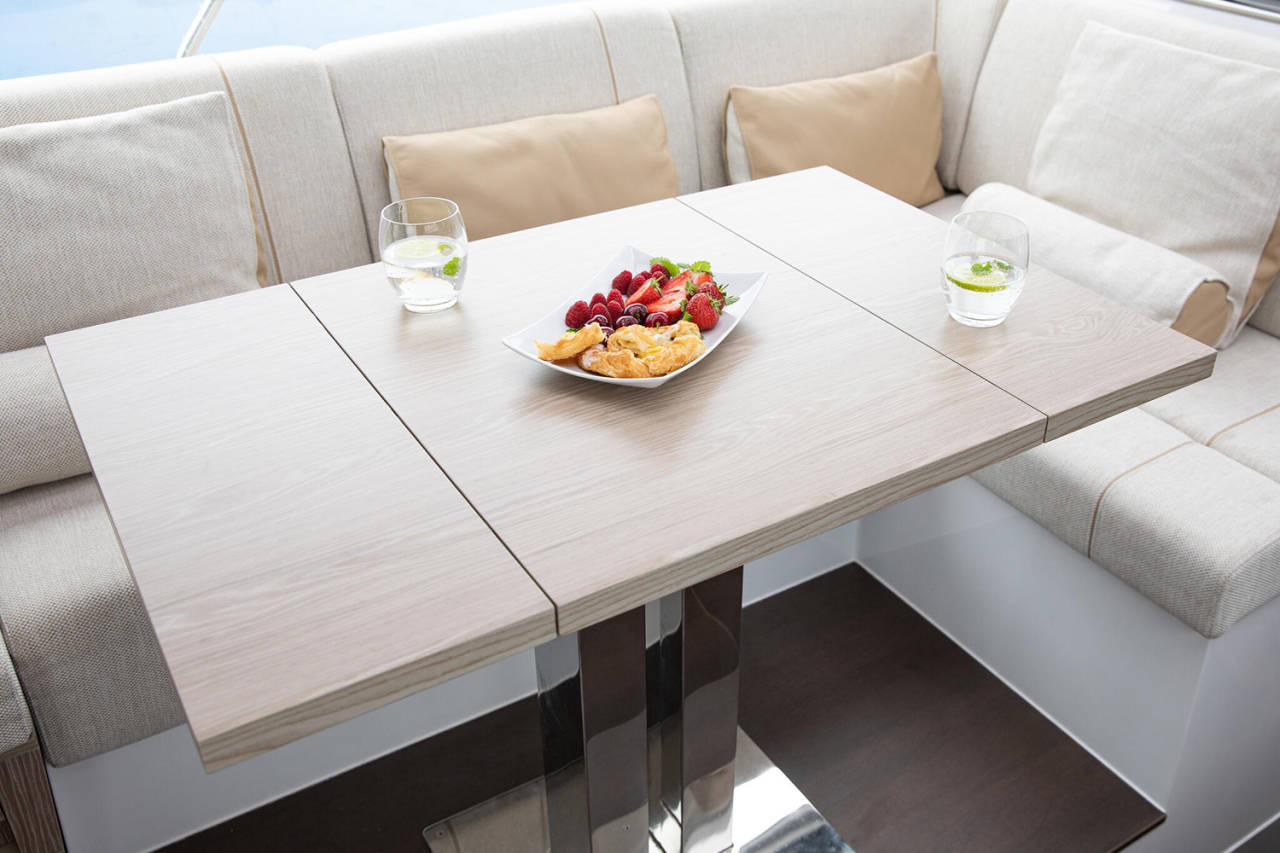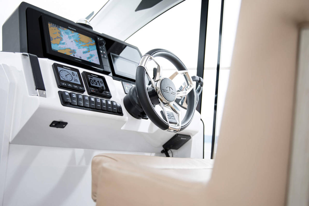 Prostrani kokpit i salon povezuju se u jedinstven prostor, uz mnoštvo pametnih detalja – podizni prozor, bimini, spoljašnji roštilj i veliku platformu za kupanje. Tri kabine i dva kupatila pružaju udobnost za do šest osoba.