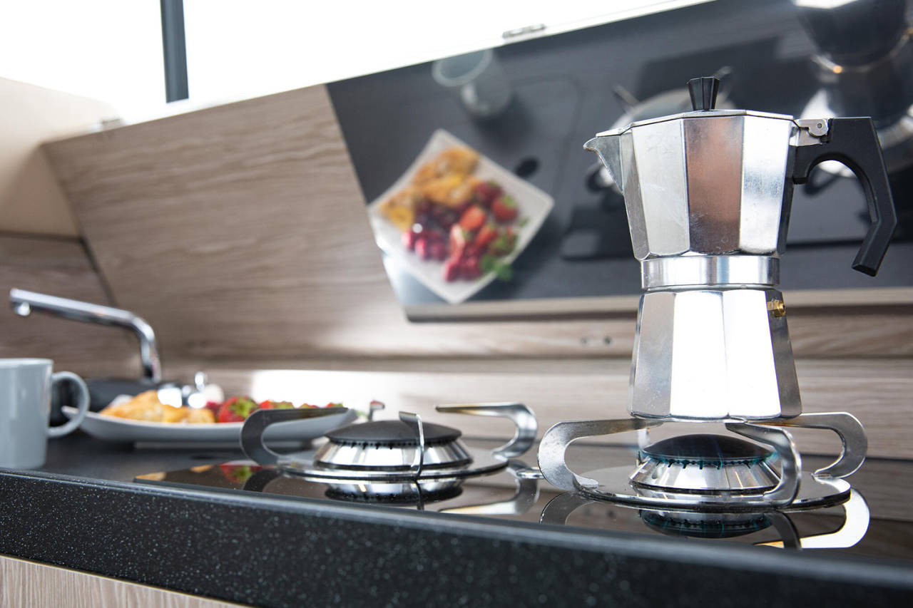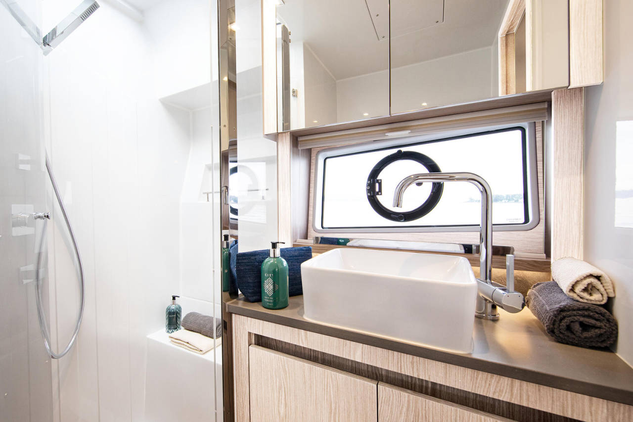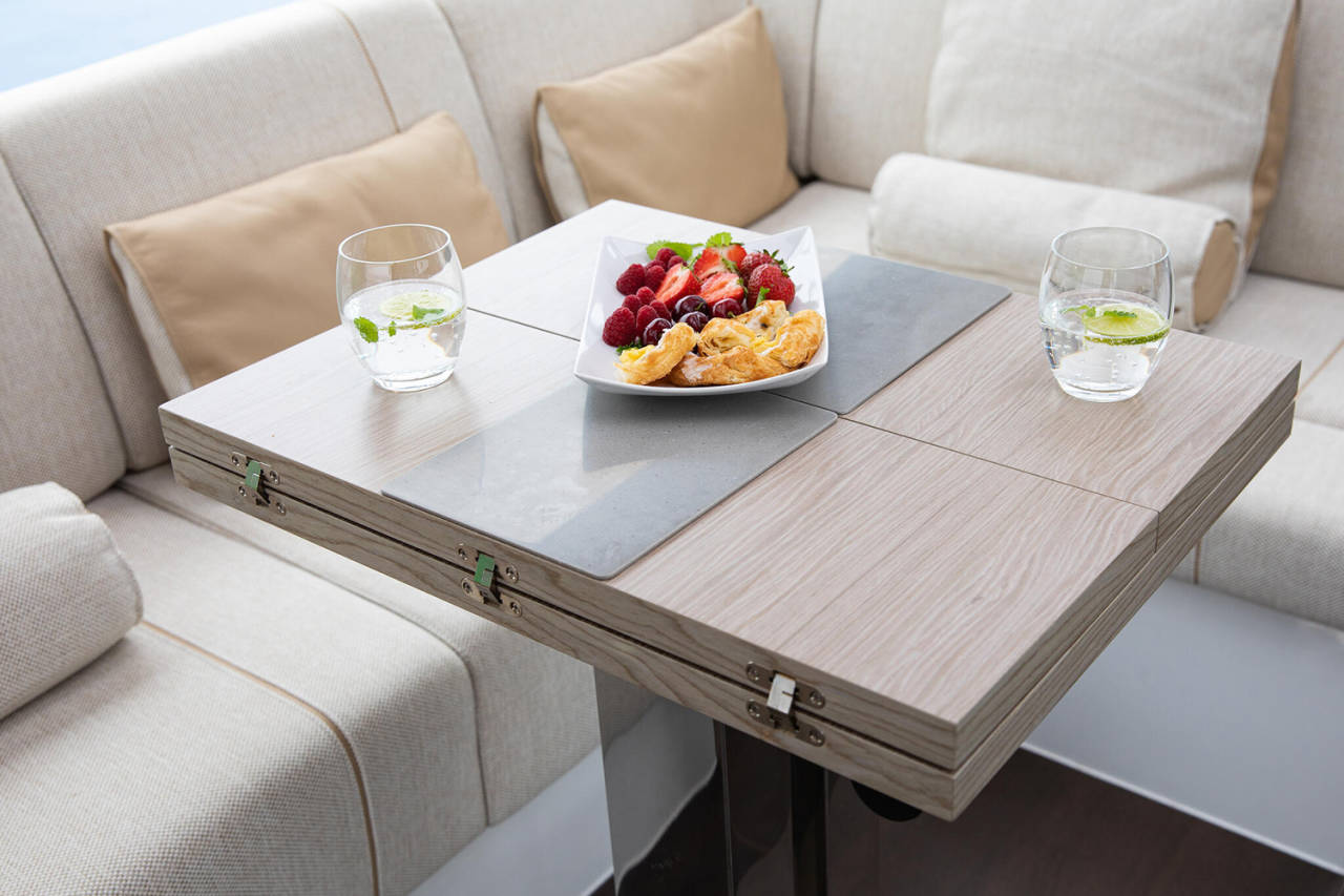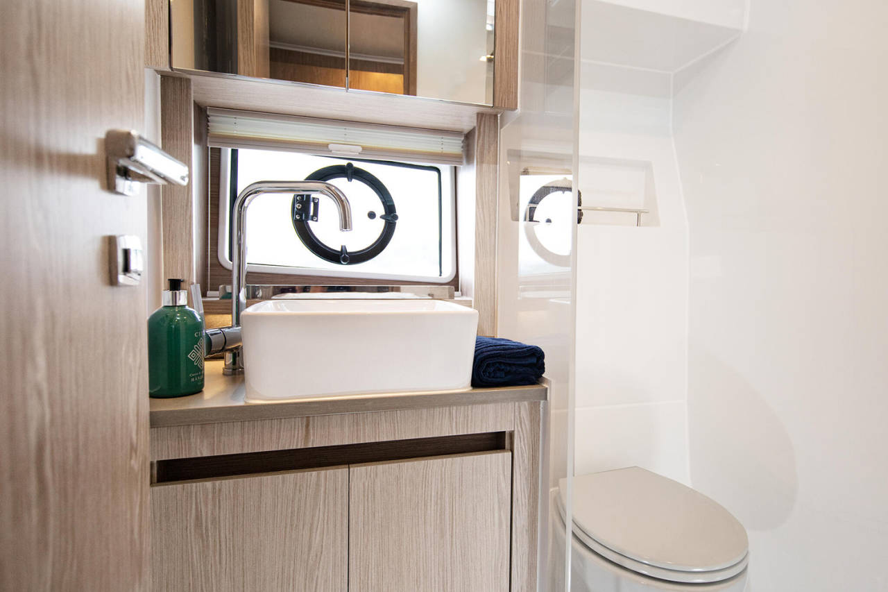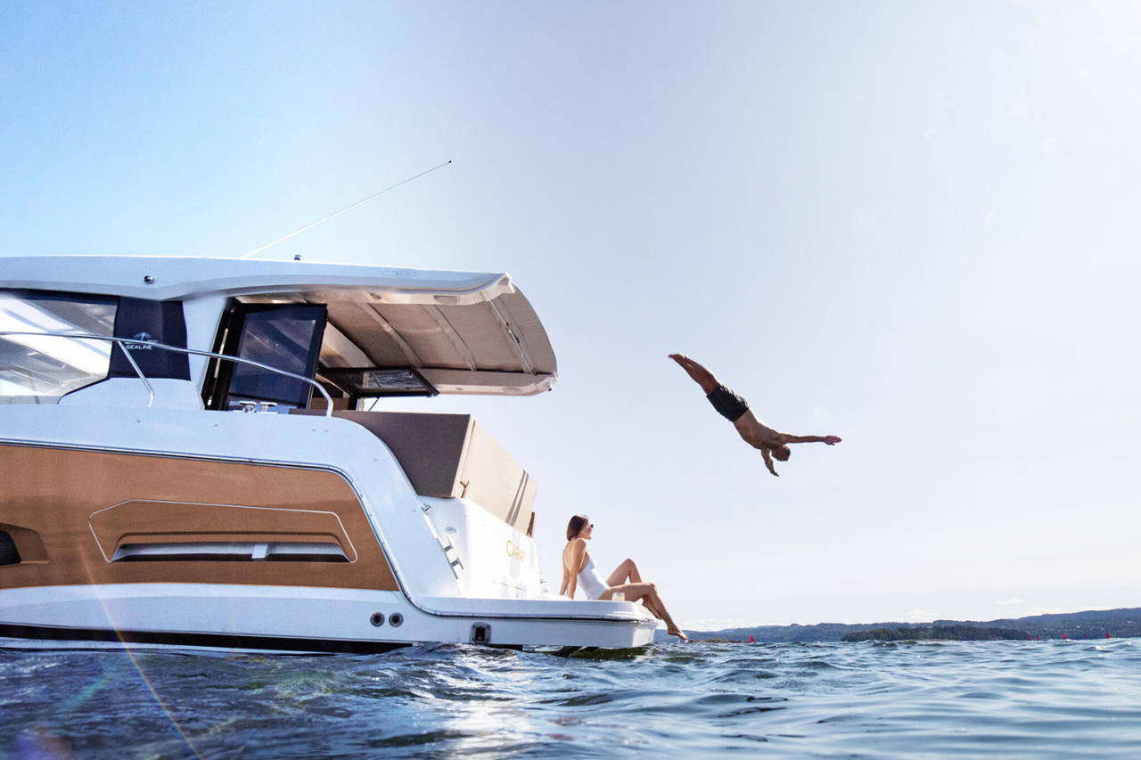 Prostrani kokpit i salon povezuju se u jedinstven prostor, uz mnoštvo pametnih detalja – podizni prozor, bimini, spoljašnji roštilj i veliku platformu za kupanje. Tri kabine i dva kupatila pružaju udobnost za do šest osoba.